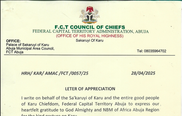 Appreciation Letter From The Office Of His Royal Highness Sakaruyi Of Karu To NBM Of Africa on its successful humanitarian outreach initiative, with its 1st Abuja Regional Summit in Karu.