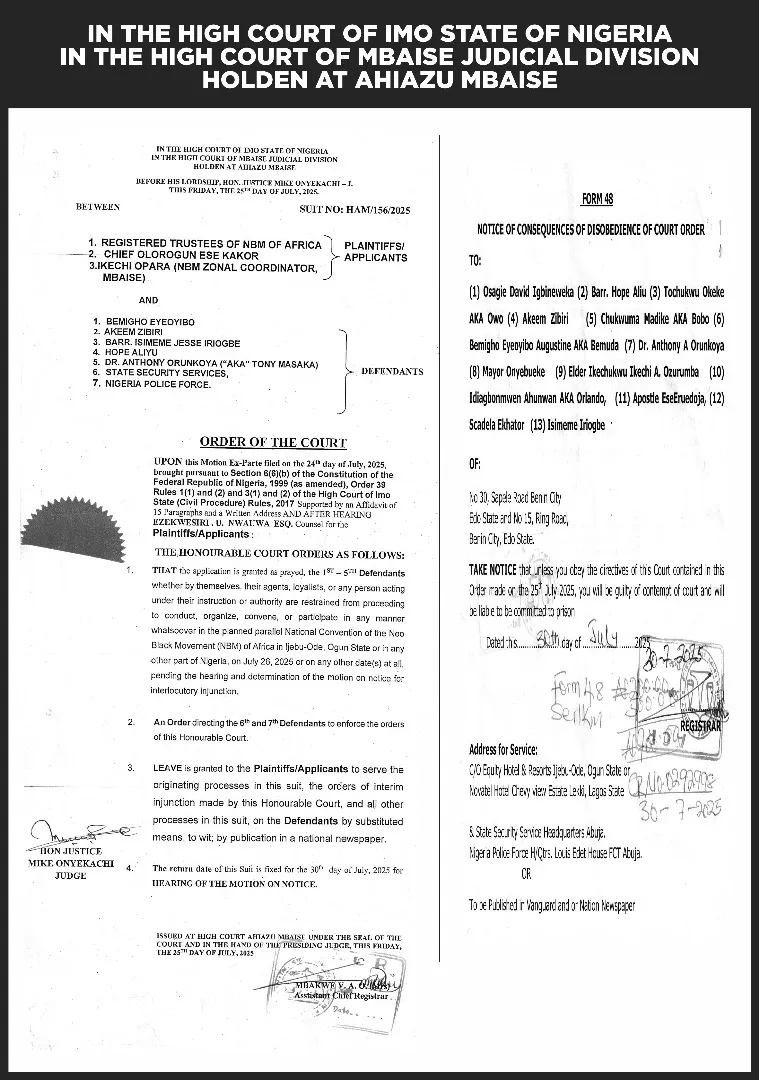 The High Court of Imo State has issued Form 48: Notice of Consequences of Disobedience to Court Order to several prominent members of the Neo Black Movement (NBM) of Africa for allegedly defying a valid court order.