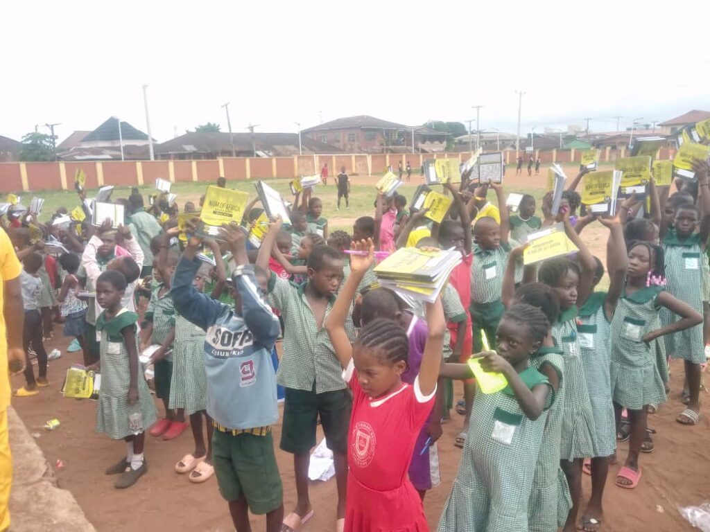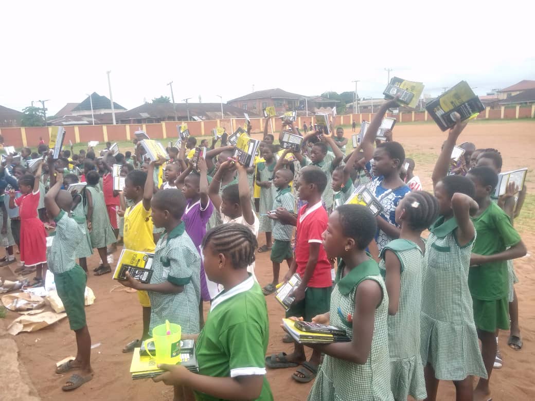 “We are here today to donate hundreds of school uniforms, notebooks, pens, math sets, and other writing materials to students of Arinze, Ezomo, and Oliha Primary Schools, all in Benin City, Edo State.